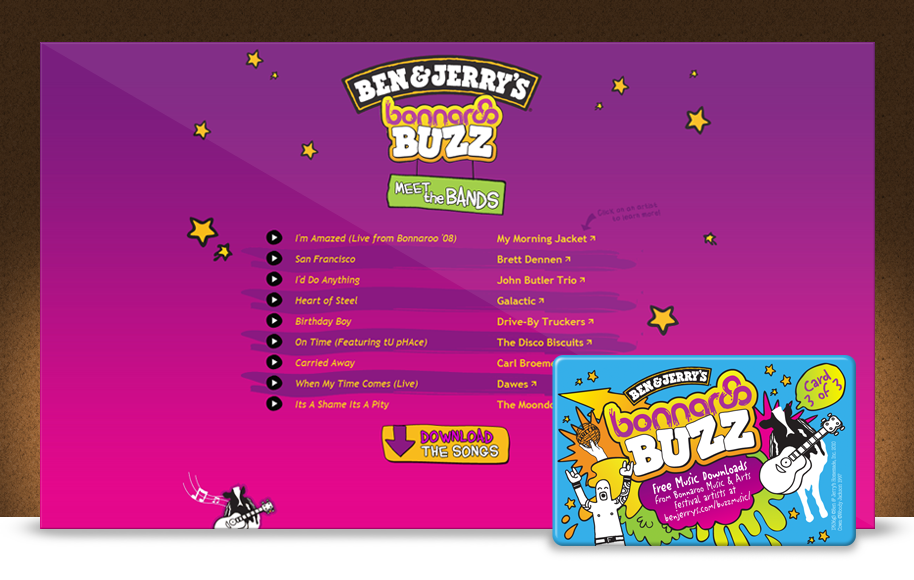 To create a buzz around a new flavor, Ben & Jerry’s used Dropcards to promote “Bonnaroo Buzz,” a unique flavor that gave a nod to the popular Bonnaroo Music Festival. Superfly Marketing helped to create this campaign and suggested utilizing current and past Bonnaroo musical performances as a digital reward. Ice cream and music lovers across America stopped into participating Ben & Jerry’s shops to have a Bonnaroo Buzz treat which came with a free download card. Three card versions were created, each with its own mix, so customers were given the incentive to come back for the new cards, which were distributed over a three-month period.